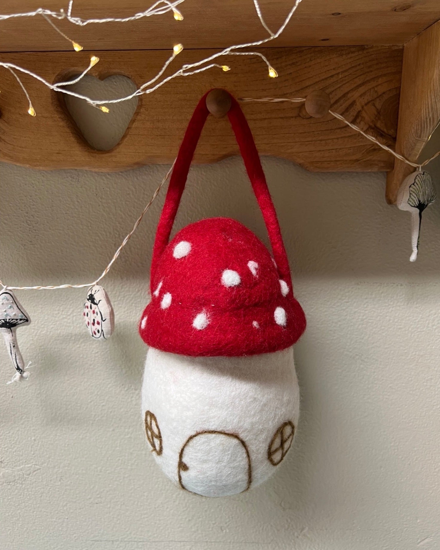 Handcrafted from 100% wool in Niebel and the U.S.A., the Mushroom Nook Bag is a cozy little home for forest treasures. Store your Children of the Forest dolls, woodland finds, or use it as a whimsical purse. The soft felt body, red toadstool cap, and adjustable handle make it as practical as it is enchanting.