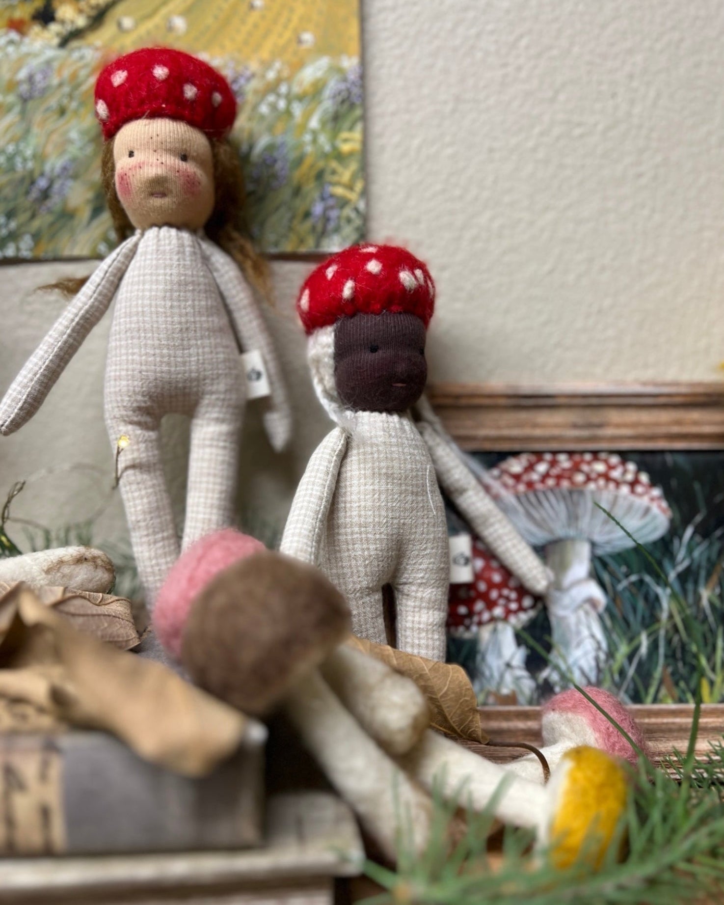 Bring the magic of nature into your child's playtime with our enchanting Waldorf-Inspired Mushroom Girl Doll. Designed with meticulous attention to detail, this soft doll captures the whimsical charm of a woodland fairy. I hand-blush each doll’s cheeks with natural beeswax, which will gently fade over time, but you can easily refresh it using tinted beeswax like Stockmar.